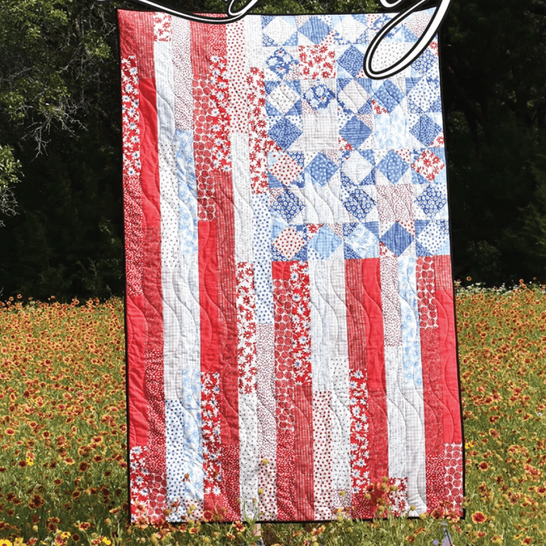 Create a vibrant 45″ x 70″ quilt inspired by the American flag, crafted using fat quarters for a unique and patriotic design. This quilt showcases bold red and white stripes paired with a striking blue star-spangled section, all framed by lush greenery and wildflowers that evoke a sense of freedom and open spaces.